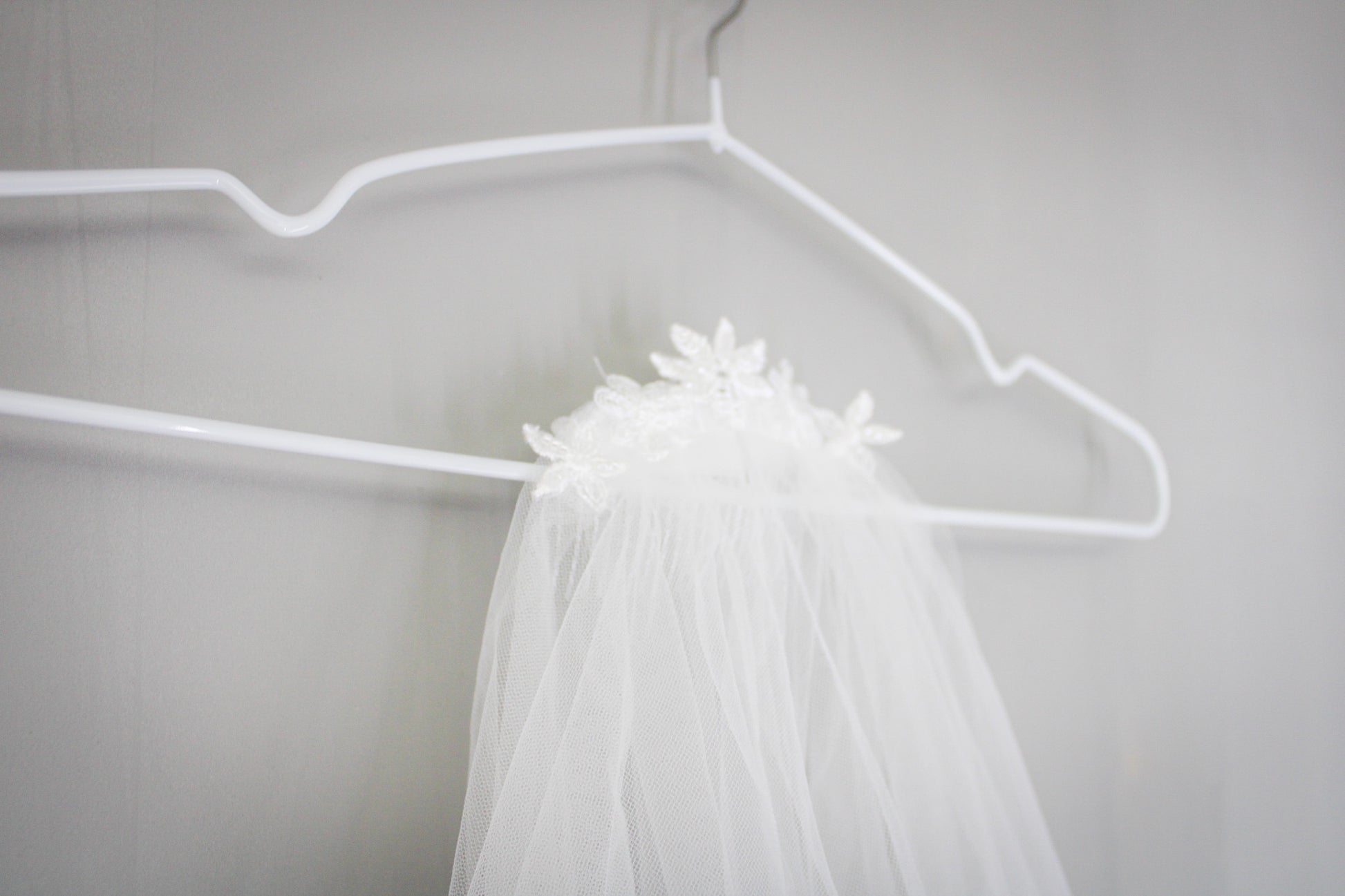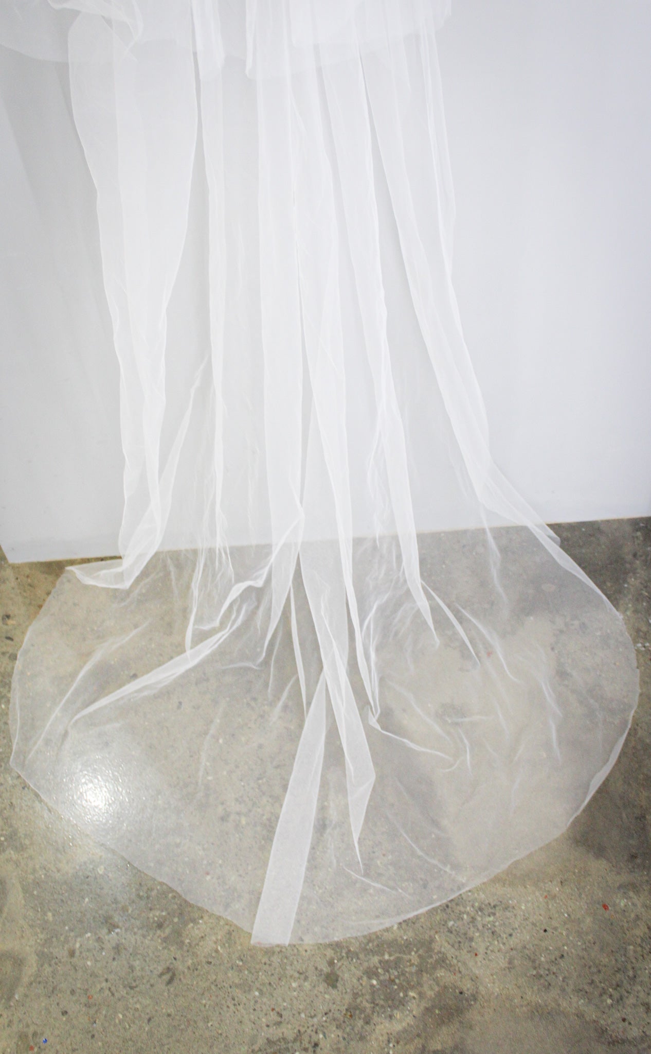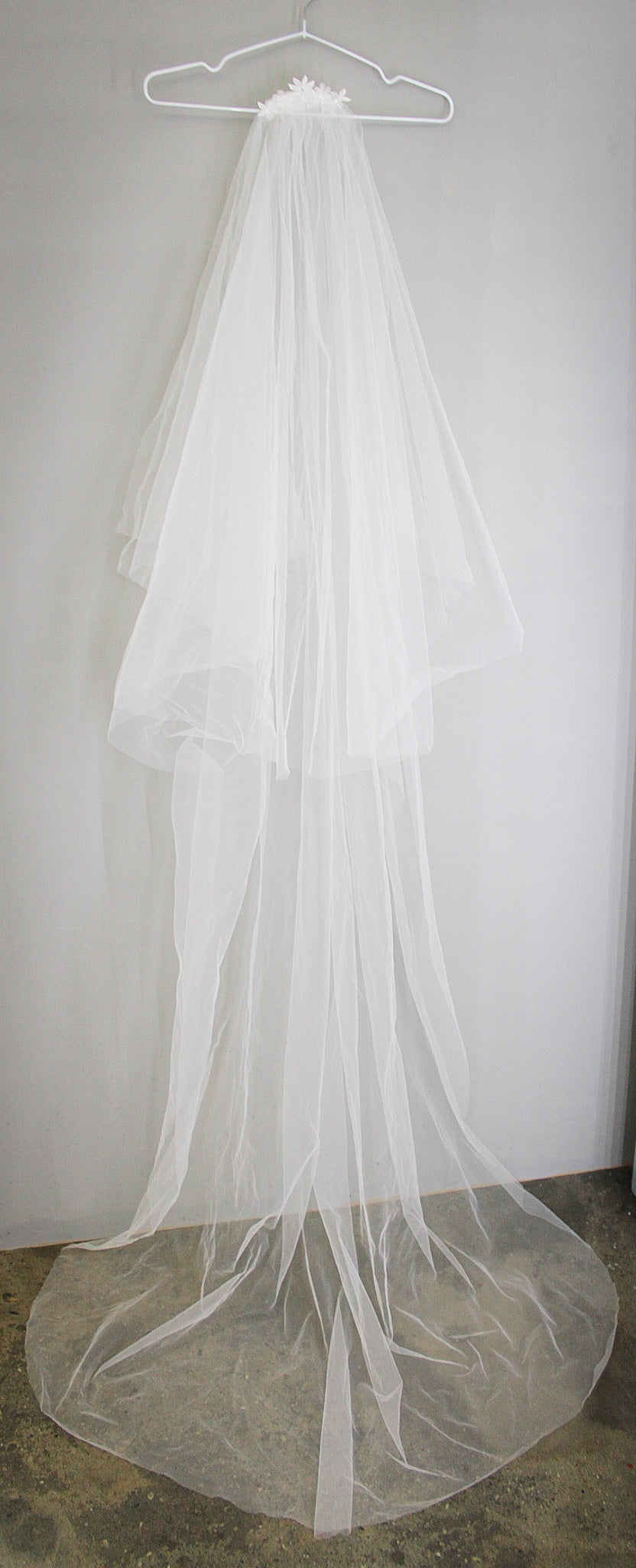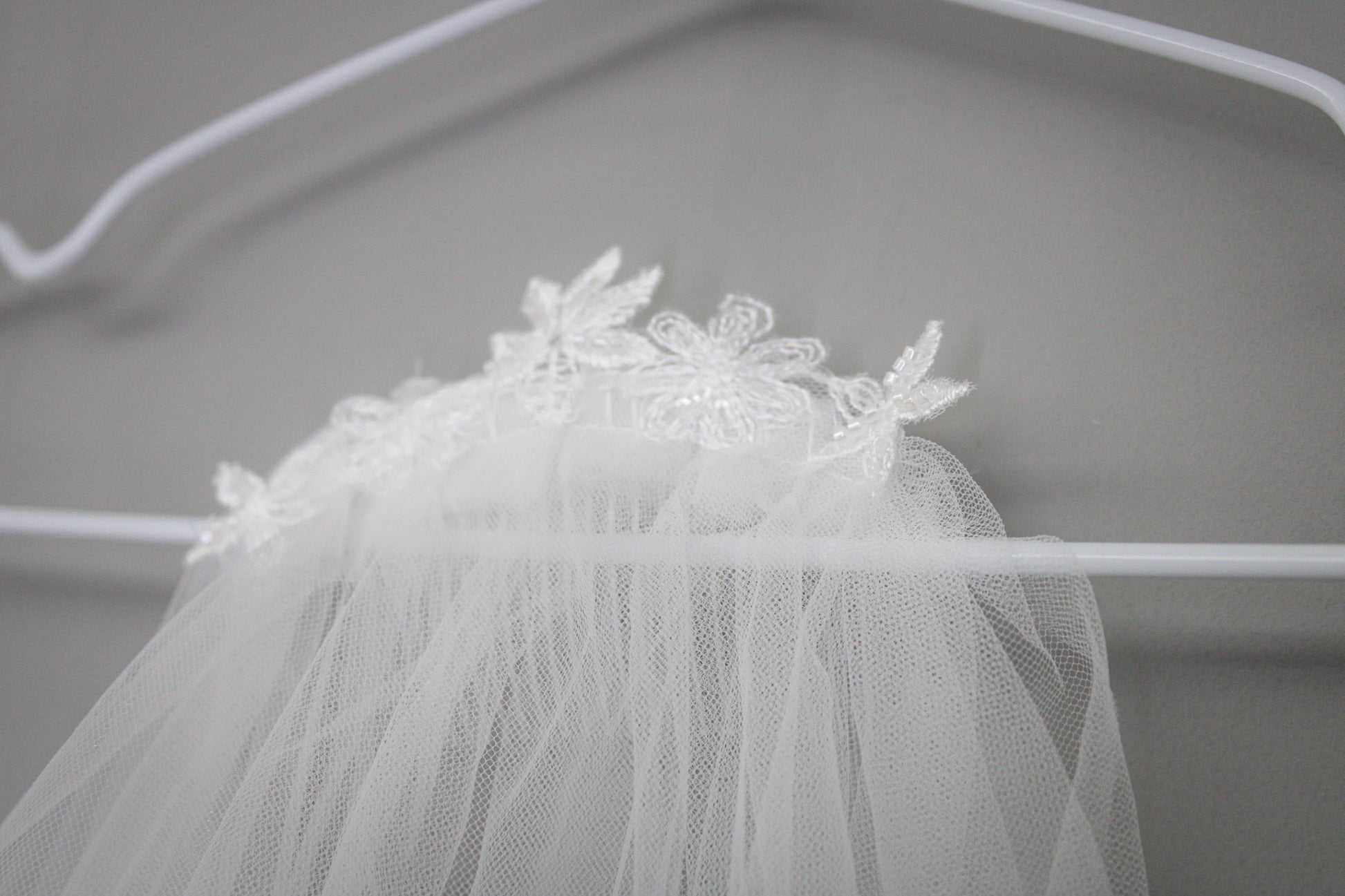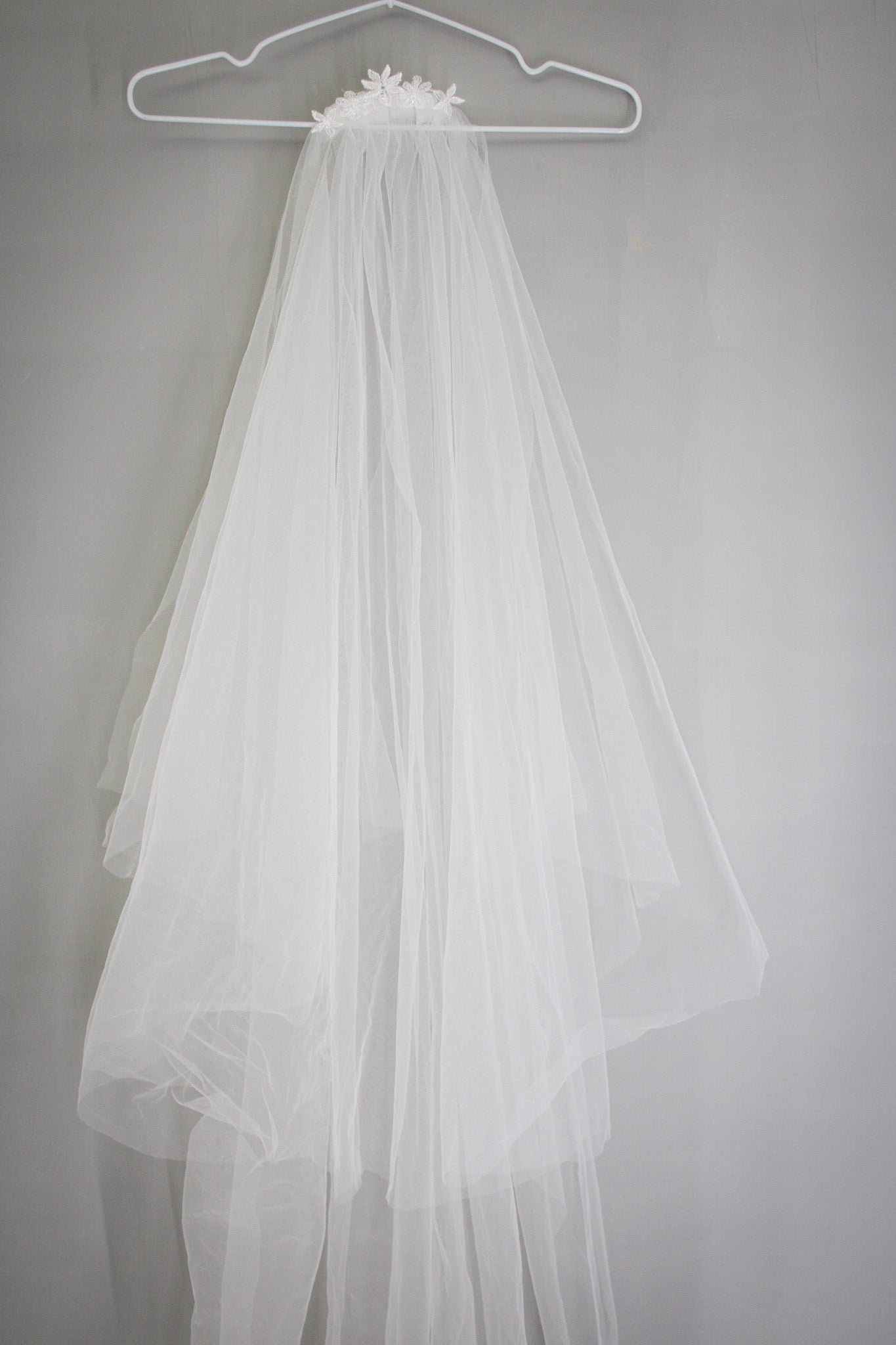 Enhance your bridal look with this stunning small lace flower detailed off white veil. This beautiful veil is secured to a hair comb and has two tiers; the top tier is 90 cm long while the bottom tier is 210 cm long, giving a total veil length of 3m.