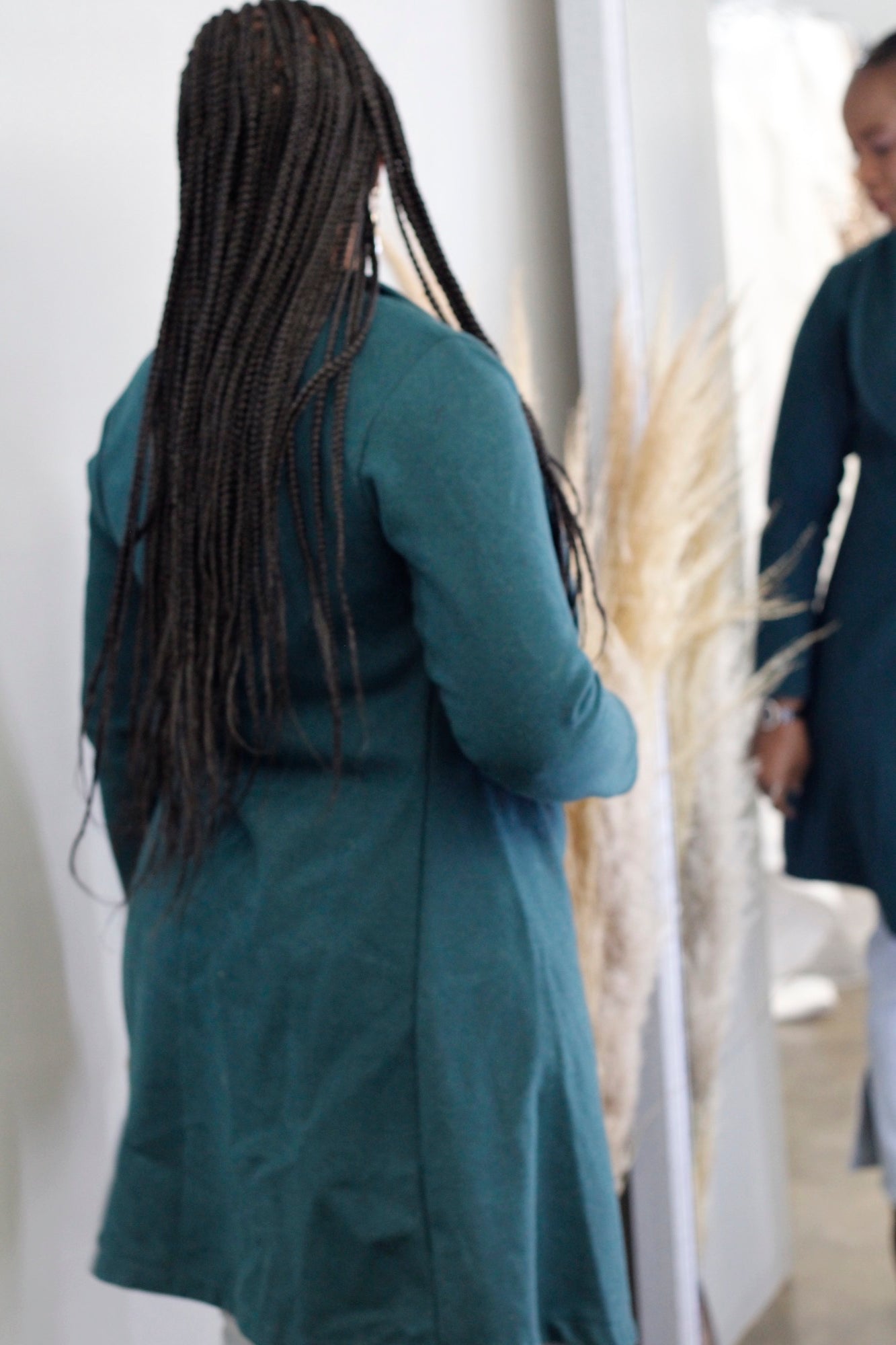 This cozy warm winter coat is hand crafted from premium melton fabric. It's an comfortable easy fit with long sleeves and a fold-over collar, hitting right above the knee with the length. It does not include any waist belt closures or pockets.