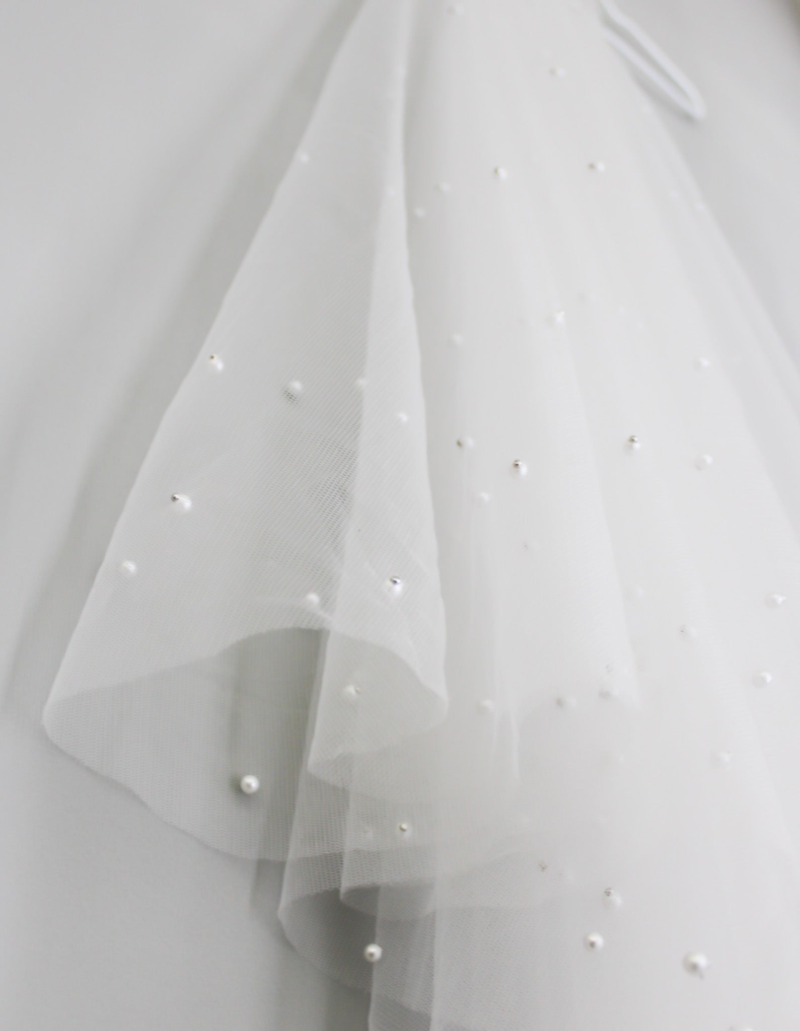 This classic pearl veil has a pearl off-white color with pearl details, a small fine detailed hair comb, and measures a total length of 3.5 meters. The top tier of the veil (that goes ofer to the front) measures 70 cm in length, and the bottom tier measures 280 cm.